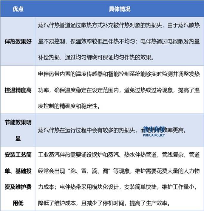 伴热行业起源于十九世纪初,应石油化工产业对维持管道温度、防冻防凝的需求,蒸汽伴热被成功引入到石油化工领域的加工、运输、存储等环节,并成为当时国际主流的伴热方式。但传统的蒸汽伴热存在温度控制力差、安装难度大、运营成本高等缺点,一定程度上制约了伴热应用领域的拓展。电伴热技术弥补了传统蒸汽伴热的缺点,通过将电伴热带平铺或缠绕在管道、罐体等被伴热对象上,将电热能量补充到工艺流程中的被伴热介质,进而达到伴热目的。与传统蒸汽伴热相比,电伴热具有以下优点: