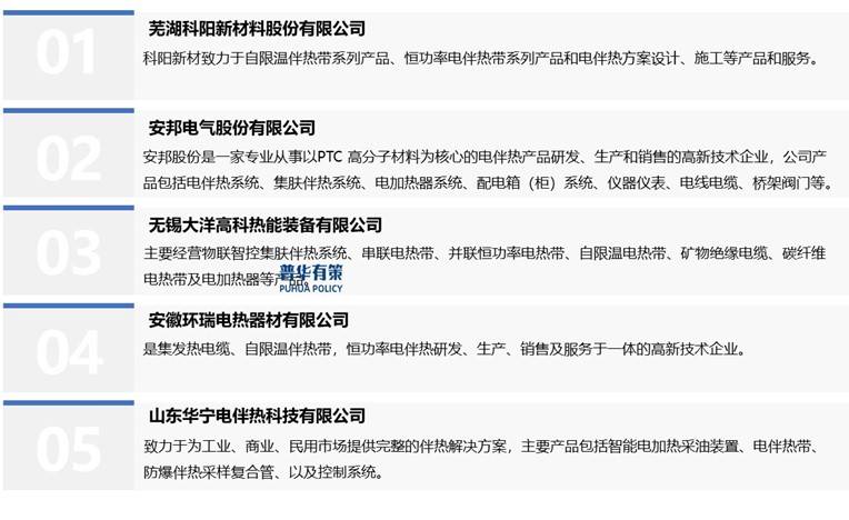 国内电伴热企业多为中小民营企业,主要分布在安徽、山东、江浙等地区,大部分企业主要经营电线电缆附加生产电伴热带业务,专门从事电伴热带生产的企业较少。国内主要企业有芜湖科阳新材料股份有限公司、安邦电气股份有限公司、无锡大洋高科热能装备有限公司、安徽环瑞电热器材有限公司、山东华宁电伴热科技有限公司等。